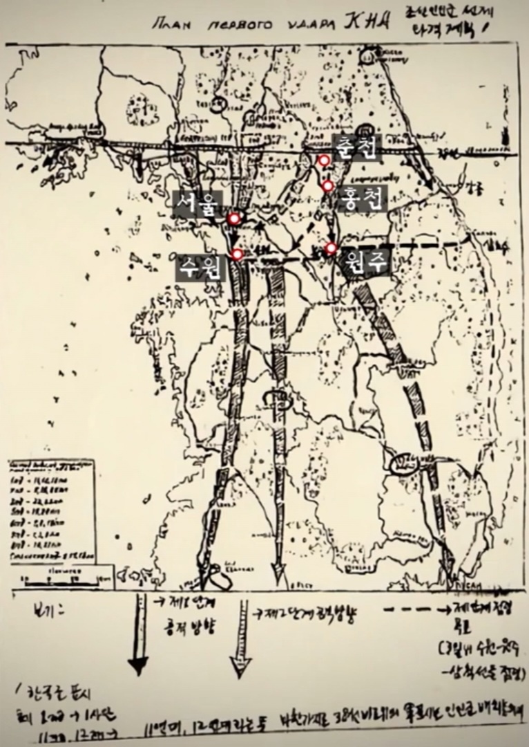 서울방향으로 북한군 1,3,4사단이 공격을 하고 북한 2,12사단은 춘천과 홍천에서 수원으로 들어와서 수원-원주 계선에서 한국군 주력을 섬멸한다는 작전을 계획했다. 조선인민군총사령부는 계획에 따른 작전을 수행할 능력이 없어 모스크바에 고문단을 파견해 달라고 몇 차례 요청했다. 1950년 9월 8일 북한 총참모장 사망 당시 소련 군사고문도 함께 사망했다는 일화가 있다.