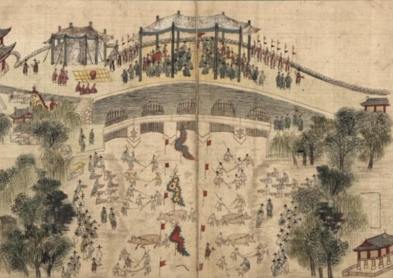 1760년 청계천 준천 사업이 시작되면서 과정이 기록으로 남아있다. '준천시사열무도 중 수문상친림관역도'가 남아있다. 그림을 보면 소와 쟁기를 동원했다. 청계천과 중랑천은 연결되어 한강으로 빠져나간다. 비가 많이 올 때 청계천 공사로 파낸 흙을 실어서 운반을 했다. 공사에 참여했던 백성들에게 일당을 지급한다. 청계천 공사는 실업자를 구제하고 홍수피해를 방지했다.