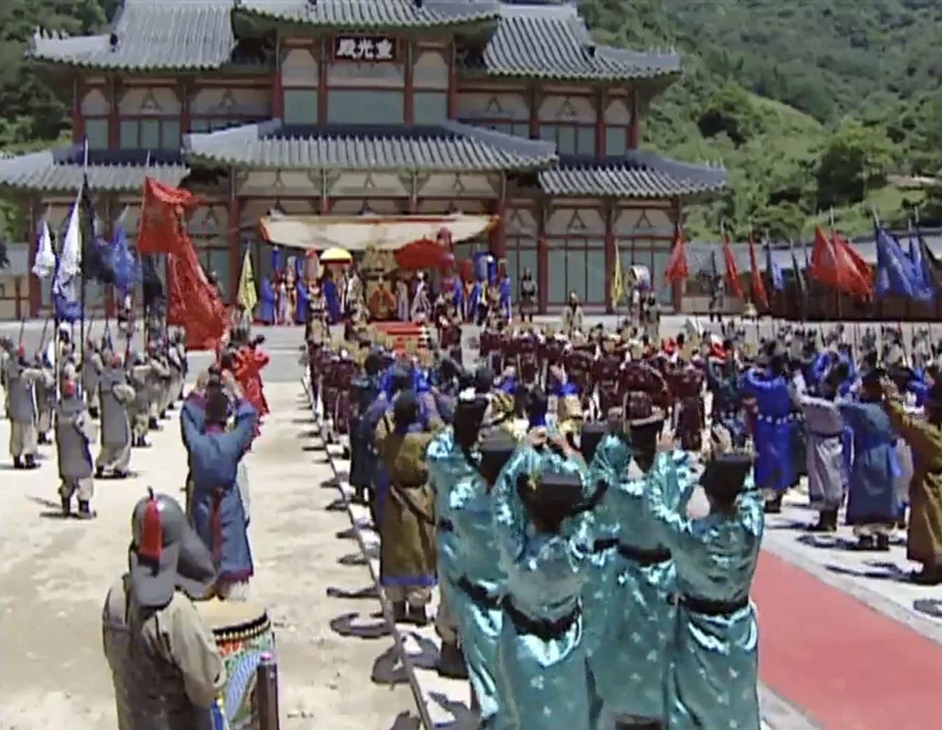 궁예는 미륵불을 자처하며 행차를 나갈 때는 황금 고깔을 쓰고 몸에는 방포를 입었다. 비단으로 두른 백마를 타고 소년소녀들로 일산(우산)과 향화를 받들게 하고 비구 2백여 명에게 찬불가를 부르며 뒤따르게 했다.
