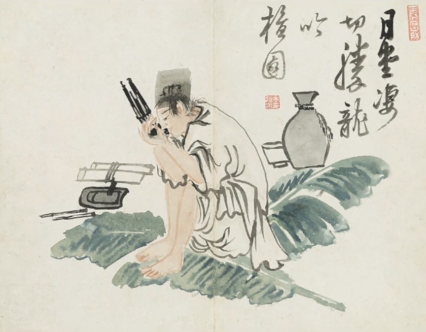 그림 속 화가는 두루마리 두 개 며칠 동안 밤새워 완성해 놓고 그동안 그림 그리느라 마시지 못했던 술로 거나하게 흥이 취한 상태에서 생황을 들고 열심히 불고 있다.