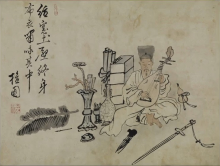 당비파를 뜯는 의젓한 선비의 모습, 얼굴을 보면 수염이 그윽하다. 아까 깔고 앉아있던 파초잎은 왼쪽에 놓여 있고 물건들이 훨씬 더 많이 등장했다. 오래된 도자기도 있고 지필묵도 있고 두루마리는 이번에는 세워져서 묶여있고 책도 잔뜩 쌓여있고 칼이 보인다. 선비에게 칼은 지조와 절개를 상징한다.