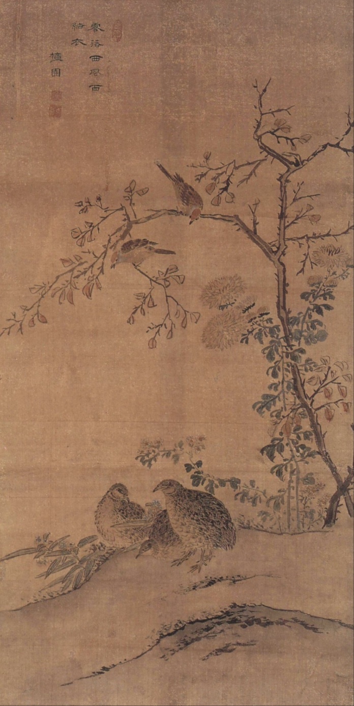 메추리가 세 마리가 있다. 수컷, 암컷,새끼일 것이다. 동식물 그림에서 주인공 새가 등장하면 두 번째 새는 대개 그리지 않는 법인데 위에 새 한쌍이 정답게 지저귀고 있다. '꼬까박새'라는 새이다. 꼬까박새가 앉아있는 나무가 쪽동백나무이다.