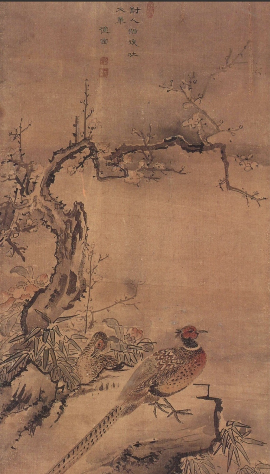 장끼는 저 멀리 허공을 응시하고 있는데 까투리는 자신의 깃털을 다듬고 있다. 김홍도가 새의 형태를 정확하게 묘사했다.