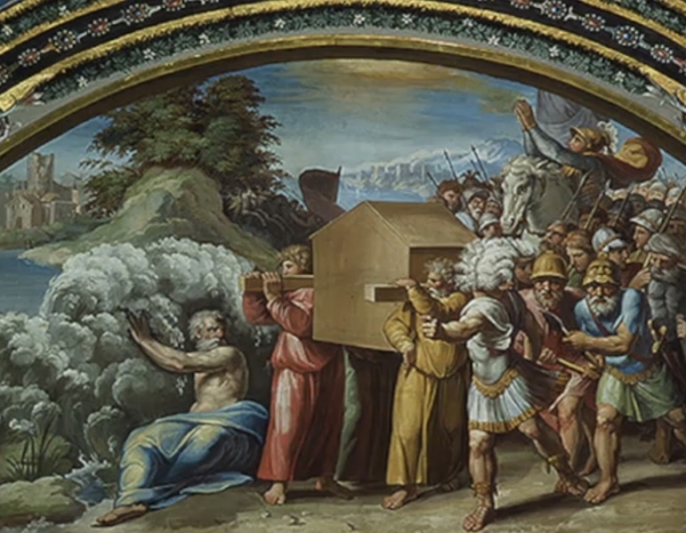 사제들이 계약 궤를 메고 가는데 물이 딱 끊어져서 마치 이집트 탈출사건 때 물을 가른 것처럼 태초의 창조 때 물을 가른 것처럼, 이때도 물을 갈랐다는 것이다. 물이 멈췄고 그 사이에 백성들이 지나갔다는 것이다.